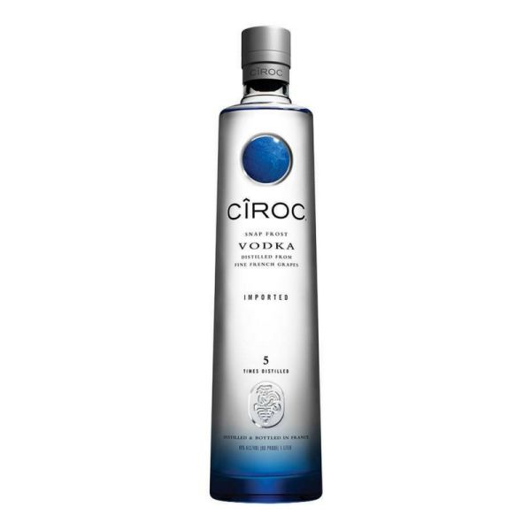 Ciroc is a high-end vodka, one of the early grape-based vodkas. This French vodka is not just made from grapes but from snap frost" grapes, which means the grapes are harvested immediately after the first frost. Distilled five times and bottled at 80 proof, it goes into a fancy bottle and then on to your stomach.