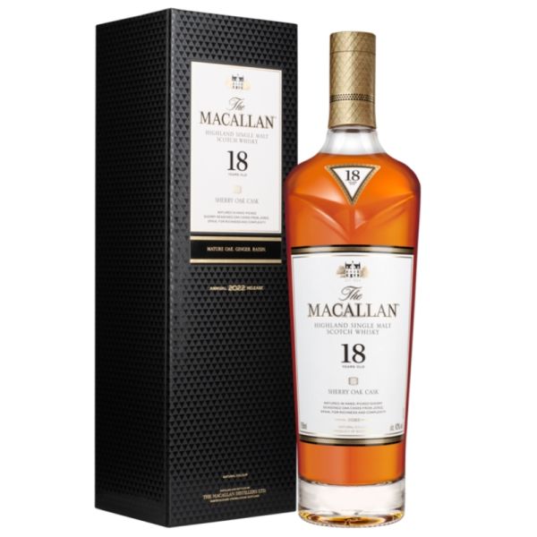The Macallan Sherry Oak 18 Years Old boasts a captivating light mahogany hue, with an aroma reminiscent of treacle tart, stem ginger, soaked raisins, and sultanas, subtly enhanced by orange zest and ground cinnamon. Its palate offers a soft, indulgent experience, featuring dark chocolate, ginger, dates, and dried apricots, harmonized by oak and vanilla sweetness. The enduring finish leaves lingering notes of dried fruits, ginger, and oak, showcasing the whisky's exceptional depth and complexity.